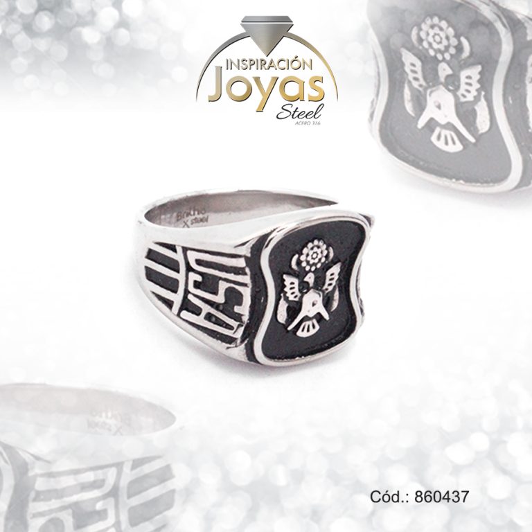 Anillo de Acero Caballero Esmalte Plateado Escudo USA NegroTalla 10 – 860437