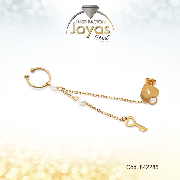 Zarcillo+Earcuff Acero Dorado Con Colgante Llave/Corazon Perla Blanca – 842285