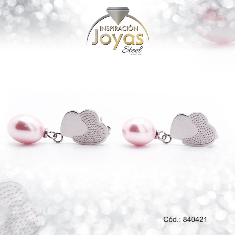 Zarcillo de Acero Colgante Perla Plateado Corazón Rosado – 840421
