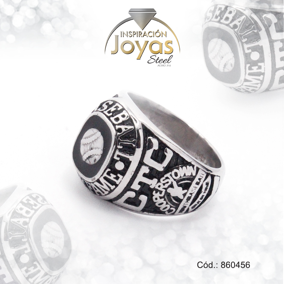 Anillo de Acero Caballero Esmalte Plateado Salon de la Fama Baseball NegroTalla 9 – 860456