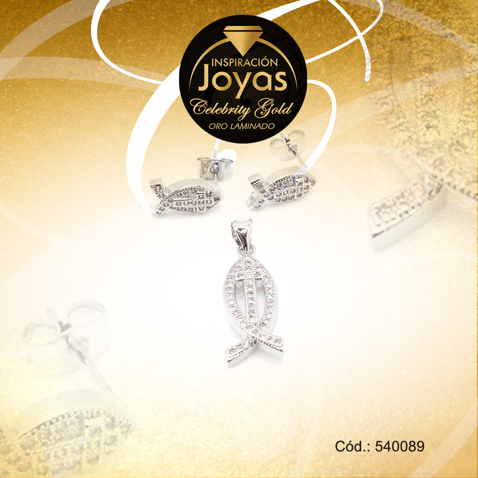 Conjunto Celebrity Gold Dama Zarcillo + Dije Plateado Pez – 540089