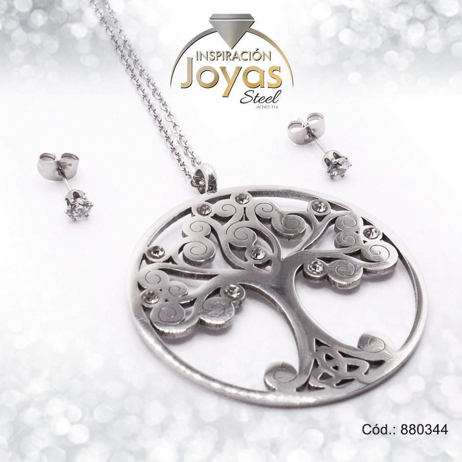 Conjunto de Acero Dama Cadena + Dije + Zarcillo Arbol Plateado Circón – 880344
