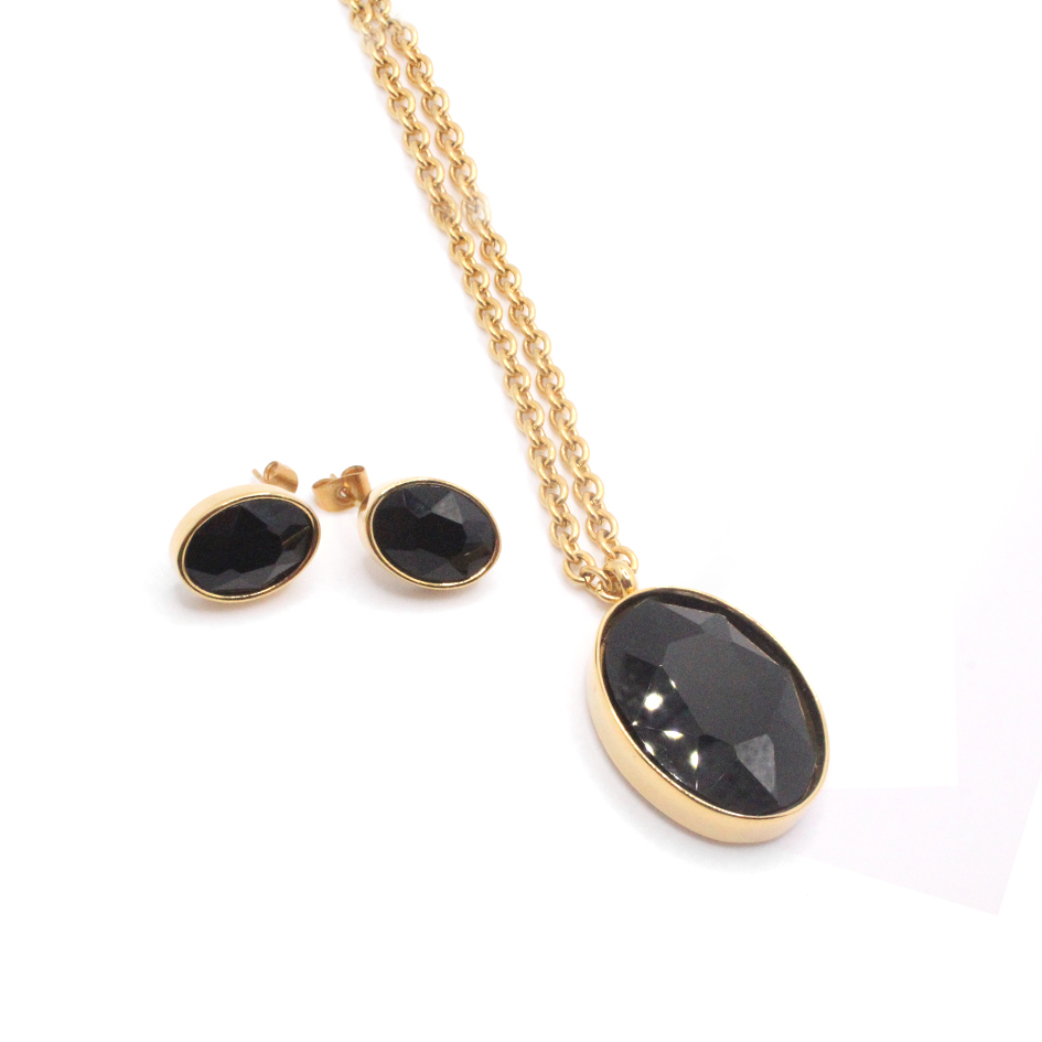 Conjunto de Acero Dama Cadena + Dije + Zarcillo Ovalo Dorado Piedra Negro – 880102