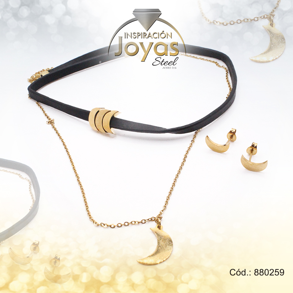 Conjunto de Acero Dama Gargantilla + Dije + Zarcillo Luna Dorado Cuero Negro – 880259