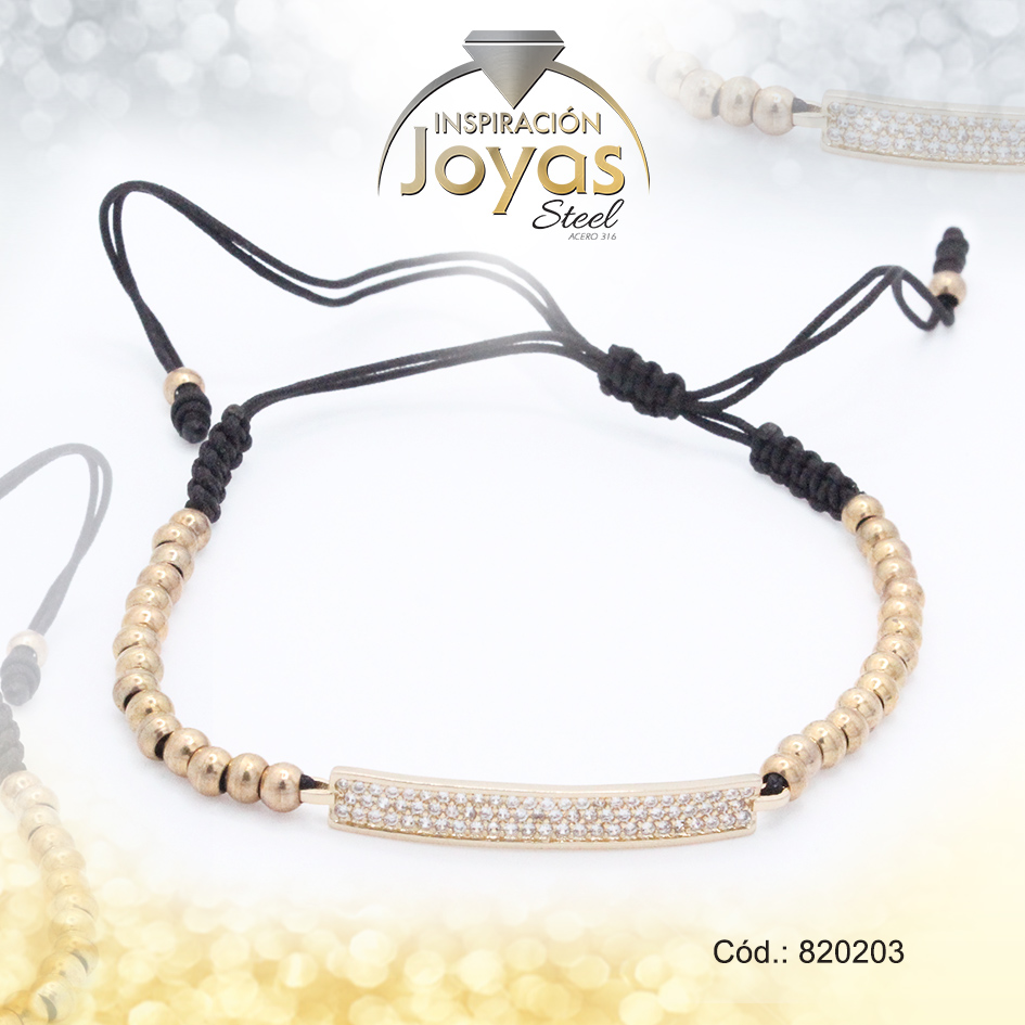 Pulsera de Acero Ajustable Hilo Negro Barra Dorado – 820203