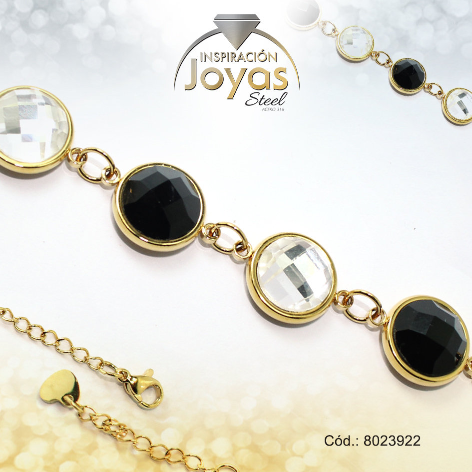 Pulsera de Acero Aleación Piedra Dorado Círculo Negro/Blanco Medida 22 cm – 8023922