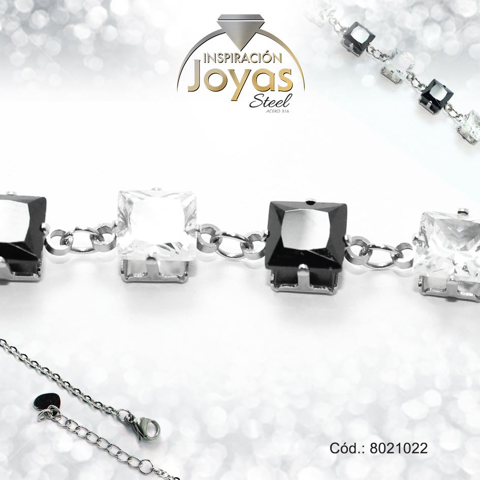 Pulsera de Acero Aleación Piedra Plateado Cuadrado Negro/Blanco Medida 22 cm – 8021022