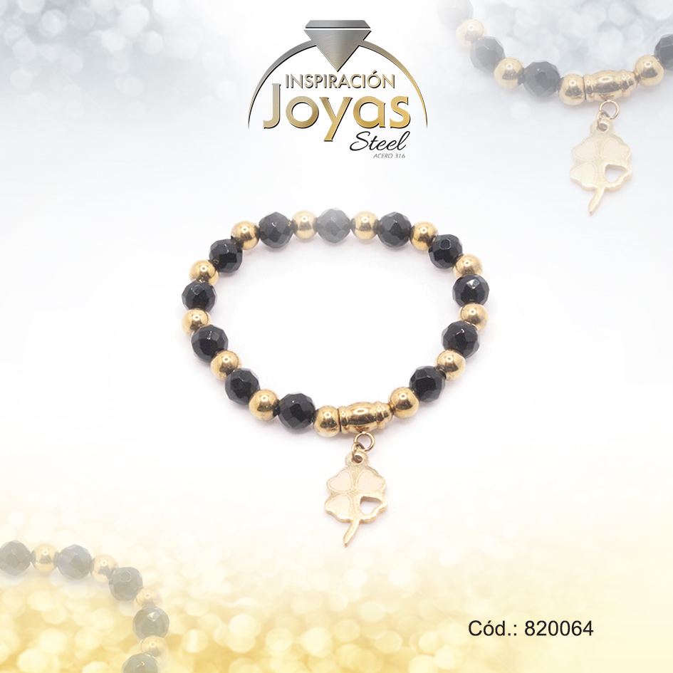 Pulsera de Acero Elástica Piedra Dorado Trébol Negro – 820064