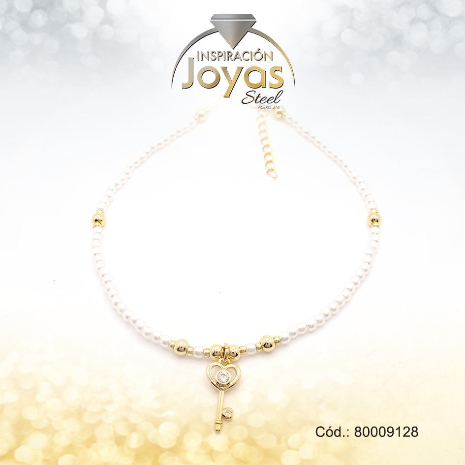 Tobillera Acero Dorado Perlas-Colgante Llave En Forma De Corazon – 80009128