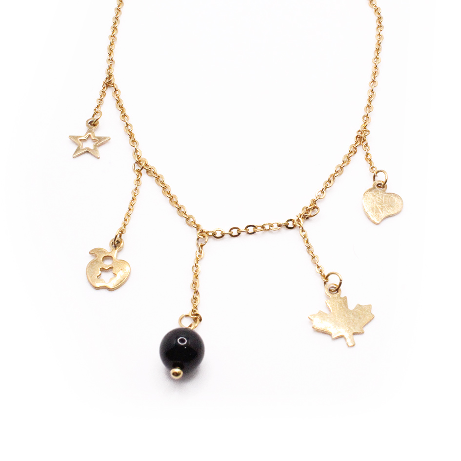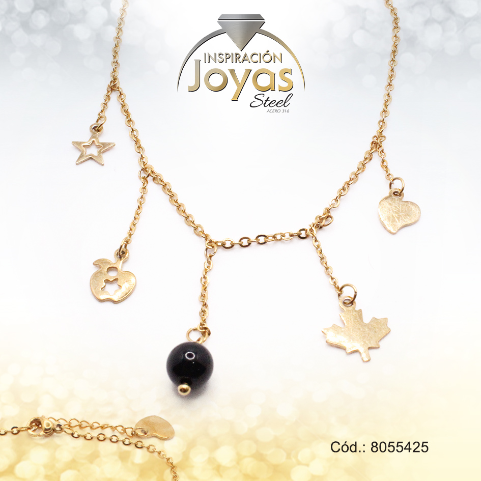 Tobillera de Acero Colgante Dorado Estrella, Manzana, Mariposa, Corazón Piedra Negro Medida 25 cm – 8055425