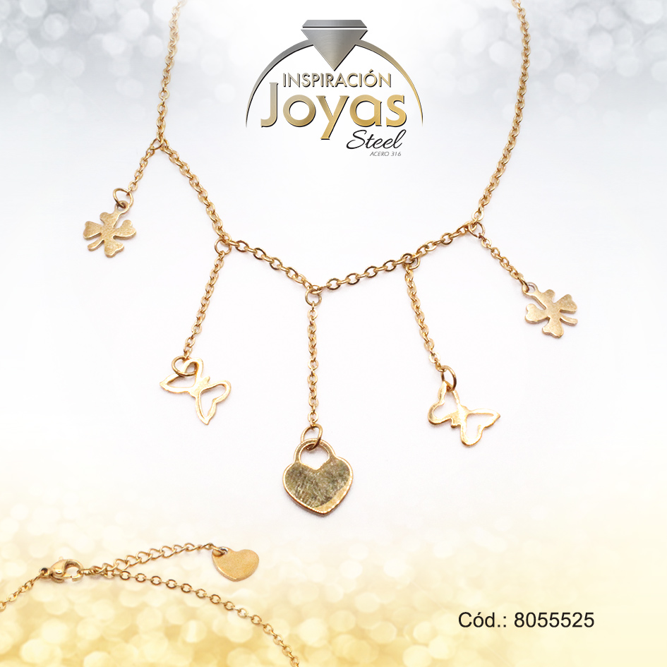 Tobillera de Acero Colgante Dorado Mariposa, Corazón, Trébol Medida 25 cm – 8055525