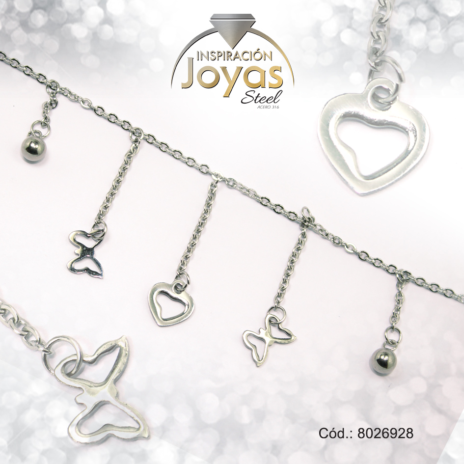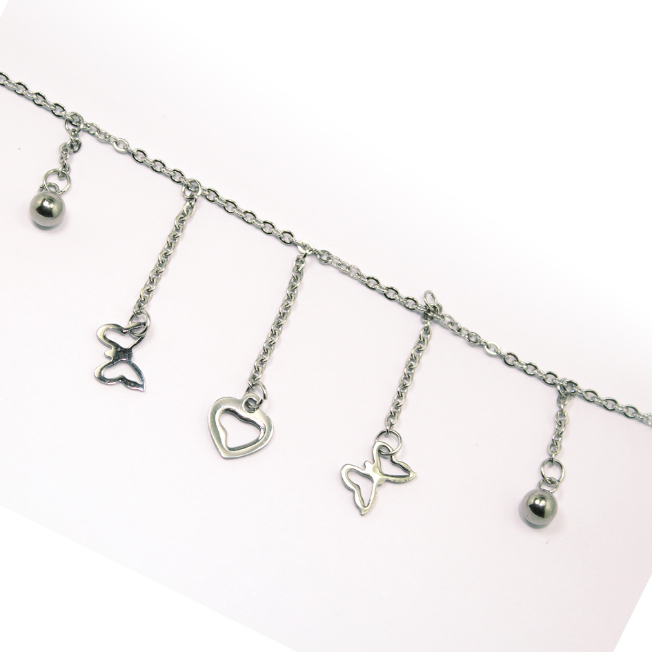 Tobillera de Acero Colgante Plateado Corazón, Mariposa, Esfera Medida 28 cm – 8026928