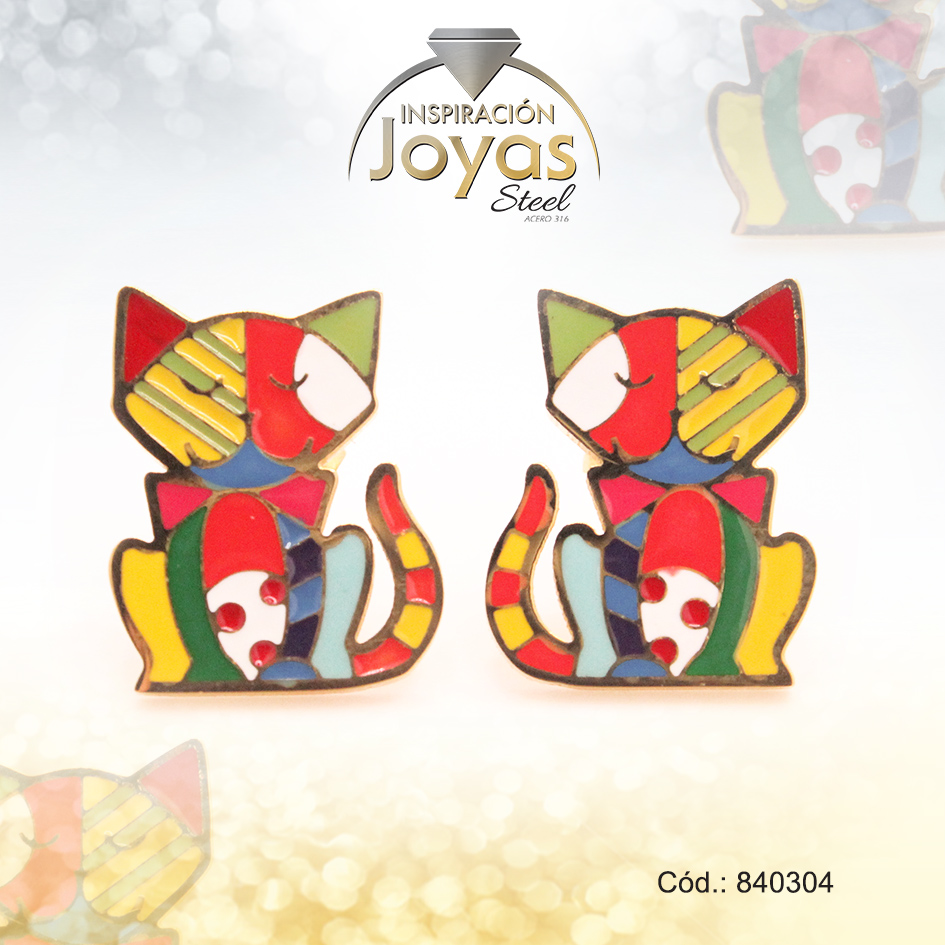 Zarcillo de Acero – Aleación Esmalte – Dorado – Gato Multi Color – 840304