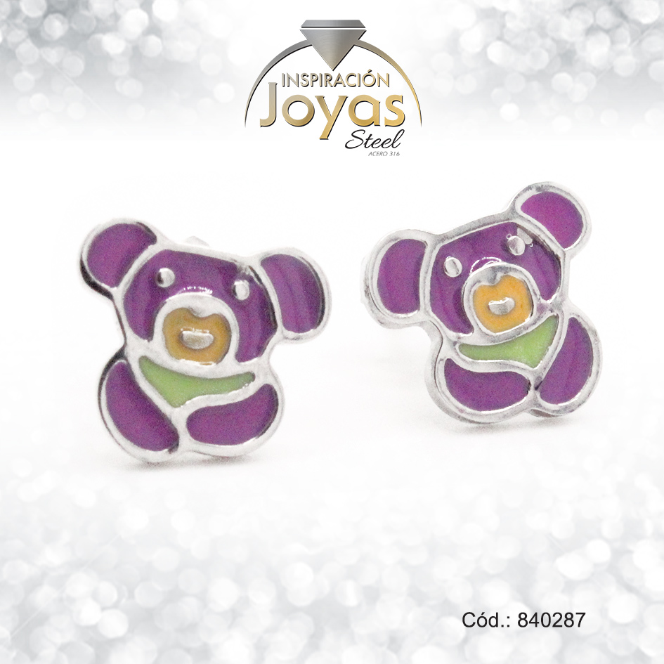 Zarcillo de Acero – Aleación Esmalte – Plateado – Oso Morado – 840287