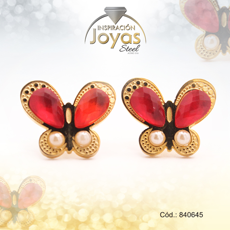 Zarcillo de Acero – Aleación Piedra – Dorado – Mariposa Rojo – 840645