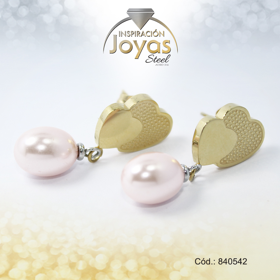 Zarcillo de Acero Colgante Perla Rosado Corazón Dorado – 840542