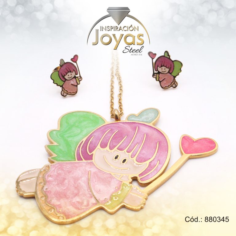 Conjunto de Acero Dama Cadena + Dije + Zarcillo Angel Dorado Esmalte Multi Color – 880345