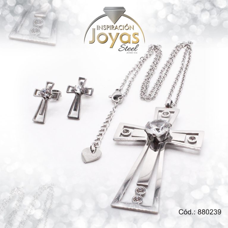 Conjunto de Acero Dama Cadena + Dije + Zarcillo Cruz Plateado Circón – 880239