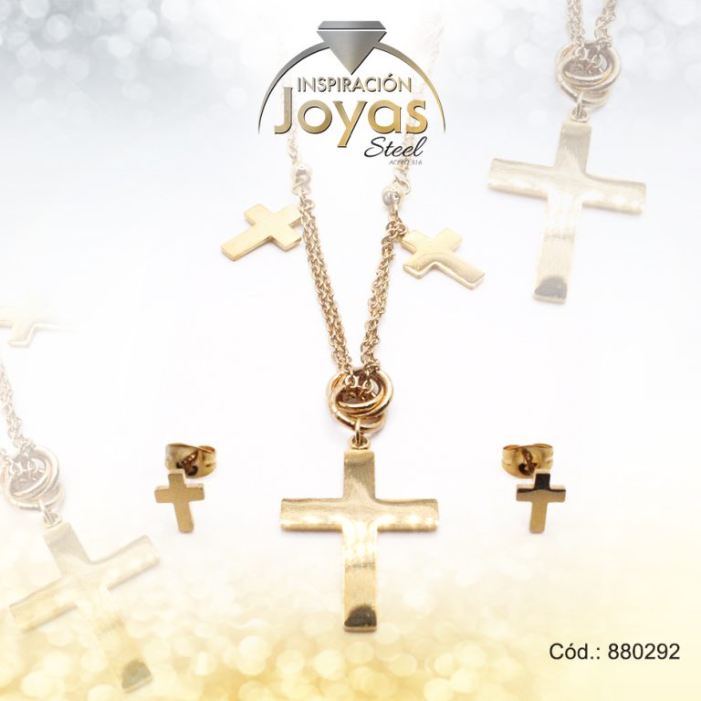Conjunto de Acero Dama Cadena + Dije + Zarcillo Cruz Dorado – 880292