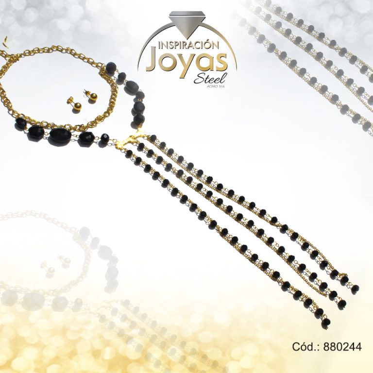 Conjunto de Acero Dama Gargantilla + Zarcillo Esfera Dorado Piedra Negro – 880244