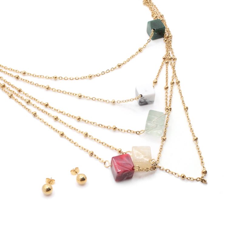 Conjunto de Acero Dama Gargantilla + Zarcillo Esfera Dorado Piedra Multi Color – 880269