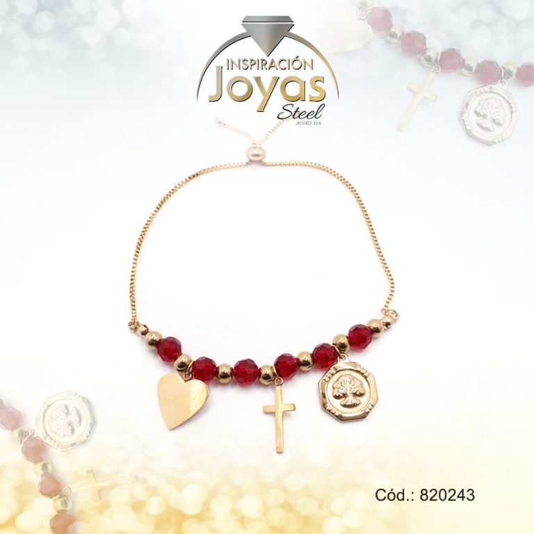 Pulsera de Acero Ajustable Hilo Dorado Corazón, Cruz, Árbol Rojo – 820243