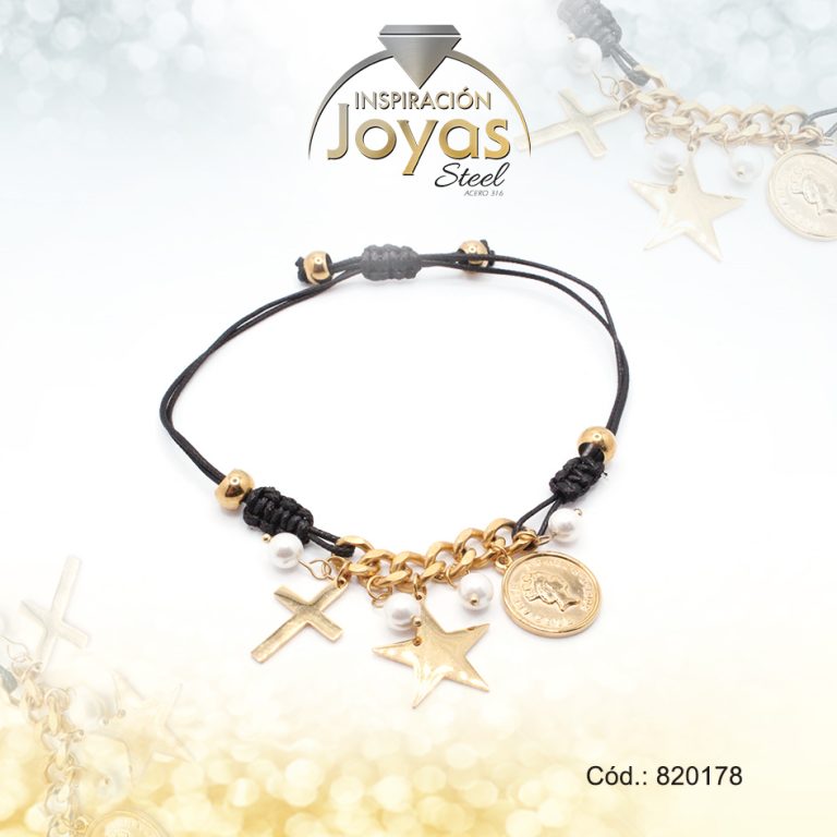 Pulsera de Acero Ajustable Hilo Negro Medalla, Cruz, Estrella Dorado – 820178