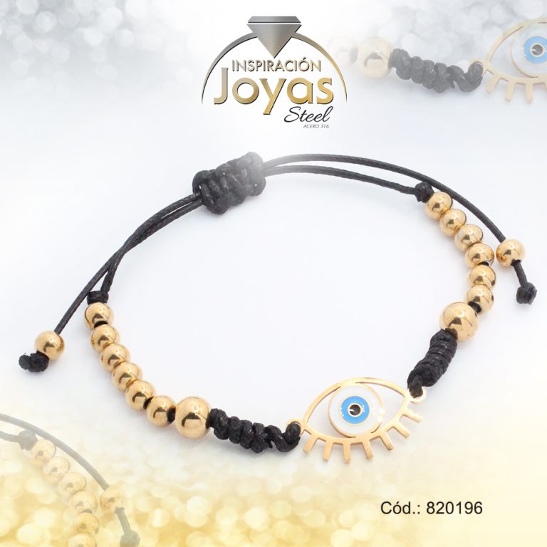 Pulsera de Acero Ajustable Hilo Negro Ojo Turco Dorado – 820196
