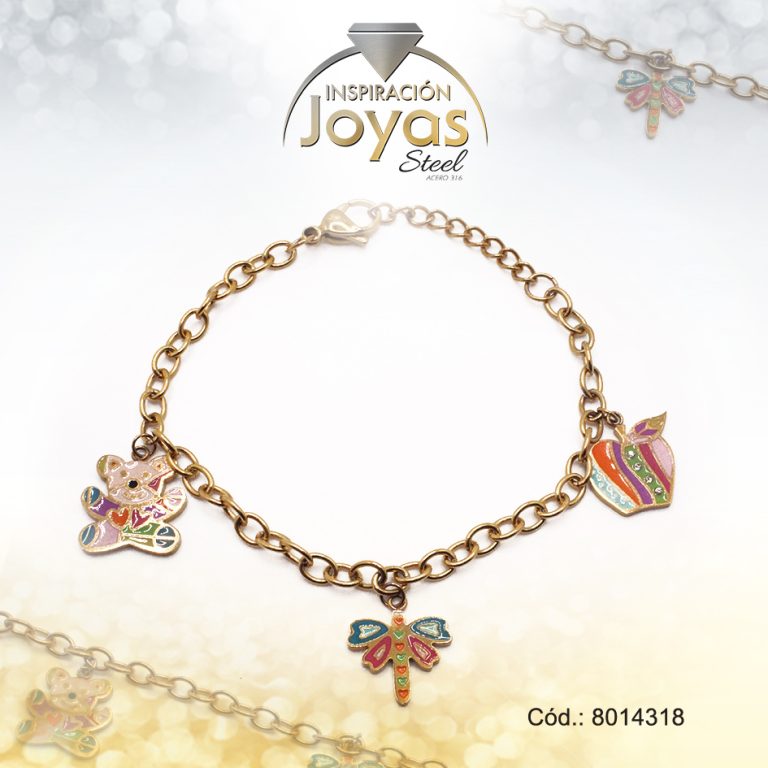 Pulsera de Acero Aleación Esmalte Dorado Oso, Libelula, Manzana Multi Color Medida 18 cm – 8014318