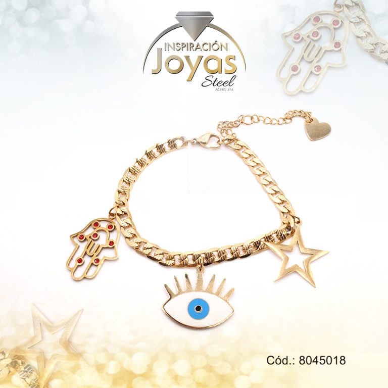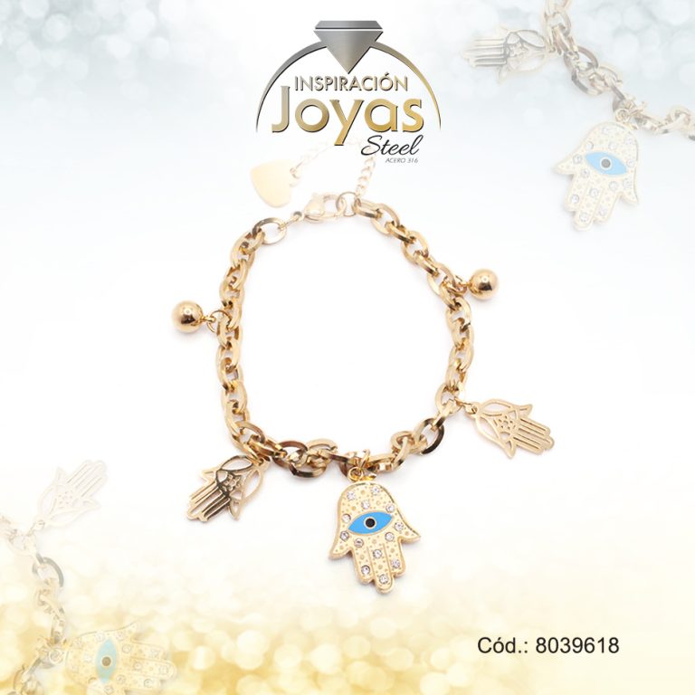 Pulsera de Acero Aleación Esmalte Dorado Mano de Fátima, Ojo Turco, Corazón Medida 18 cm – 8045018