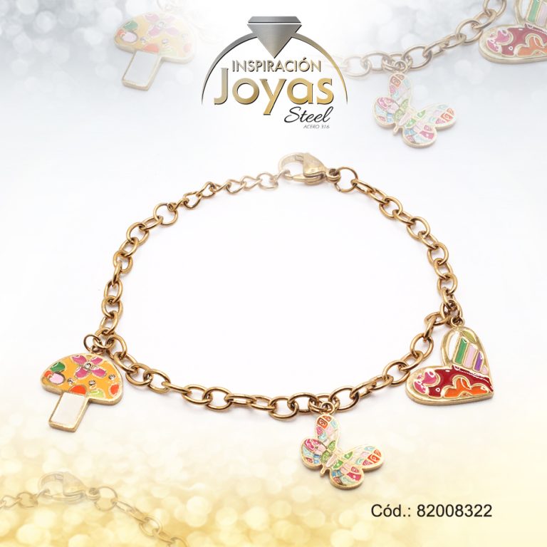 Pulsera de Acero Aleación Esmalte Dorado Hongo, Mariposa, Corazón Medida 22 cm – 82008322