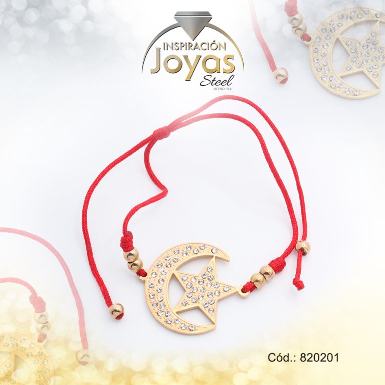 Pulsera de Acero Ajustable Hilo Rojo Luna, Estrella Dorado – 820201