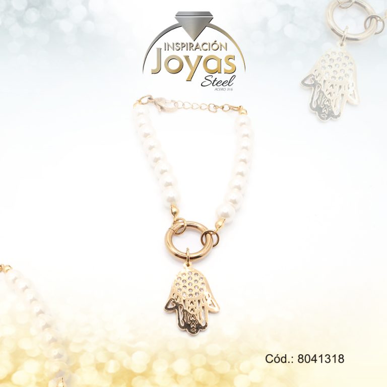 Pulsera de Acero Aleación Micro Circón Dorado Mano de Fátima Perla Medida 18 cm – 8041318