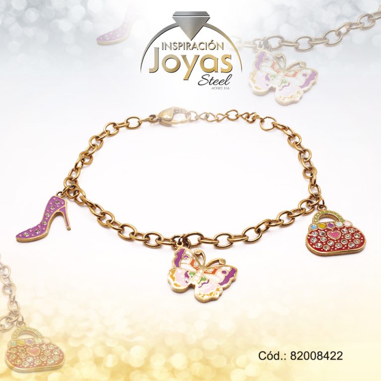 Pulsera de Acero Aleación Esmalte Dorado Zapato, Mariposa, Bolso Medida 22 cm – 82008422