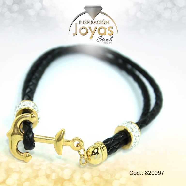 Pulsera de Acero Aleación Semi Cuero Dorado Ancla Negro – 820097