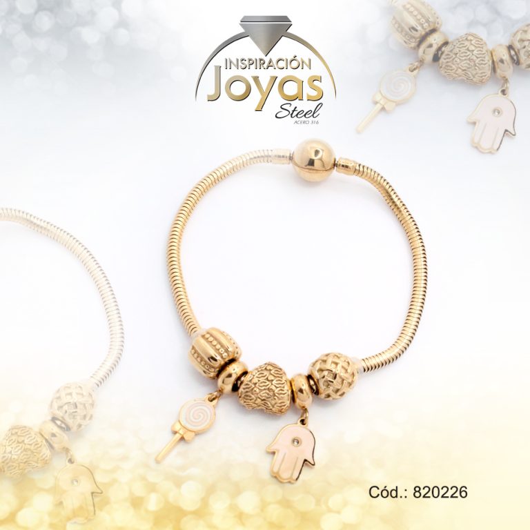 Pulsera de Acero Variado Esmalte Dorado Pandora Mano de Fátima, Chupeta Blanco – 820226