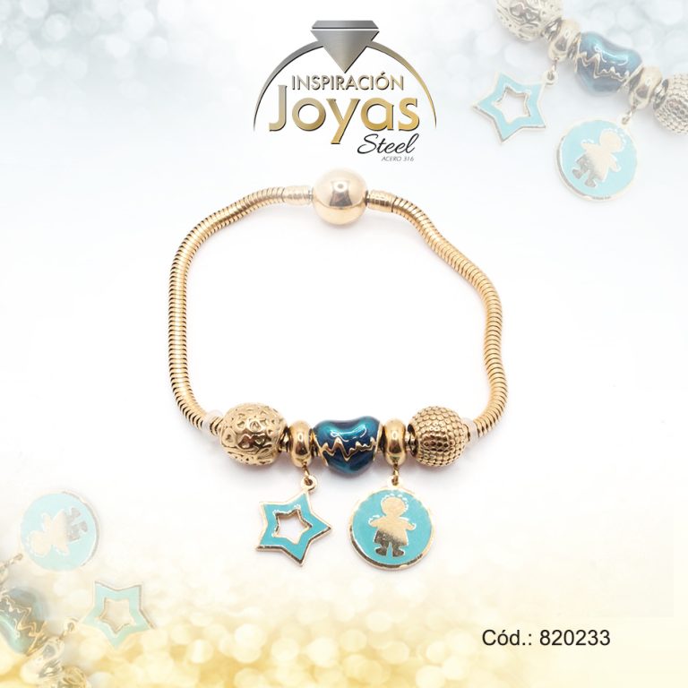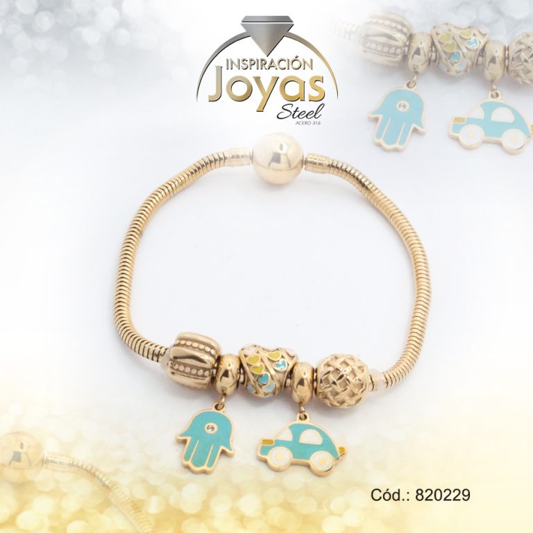 Pulsera de Acero Variado Esmalte Dorado Pandora Mano de Fátima, Carro Azul – 820229