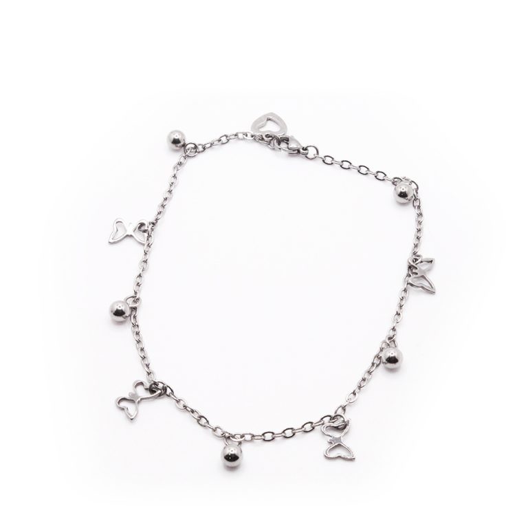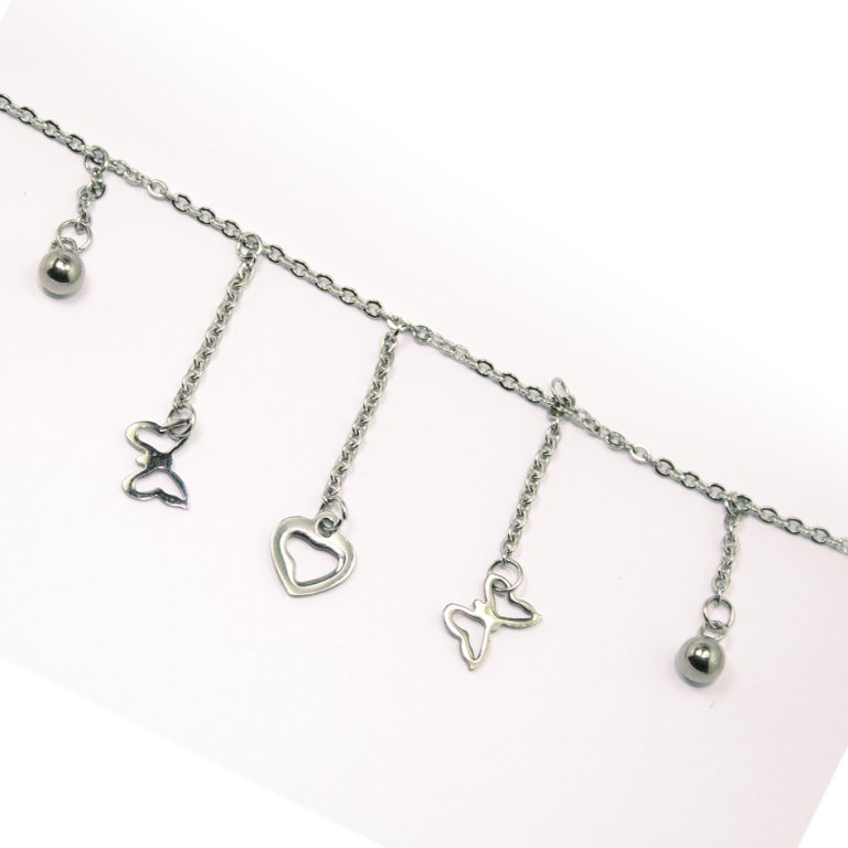 Tobillera de Acero Colgante Plateado Corazón, Mariposa, Esfera Medida 25 cm – 8001425