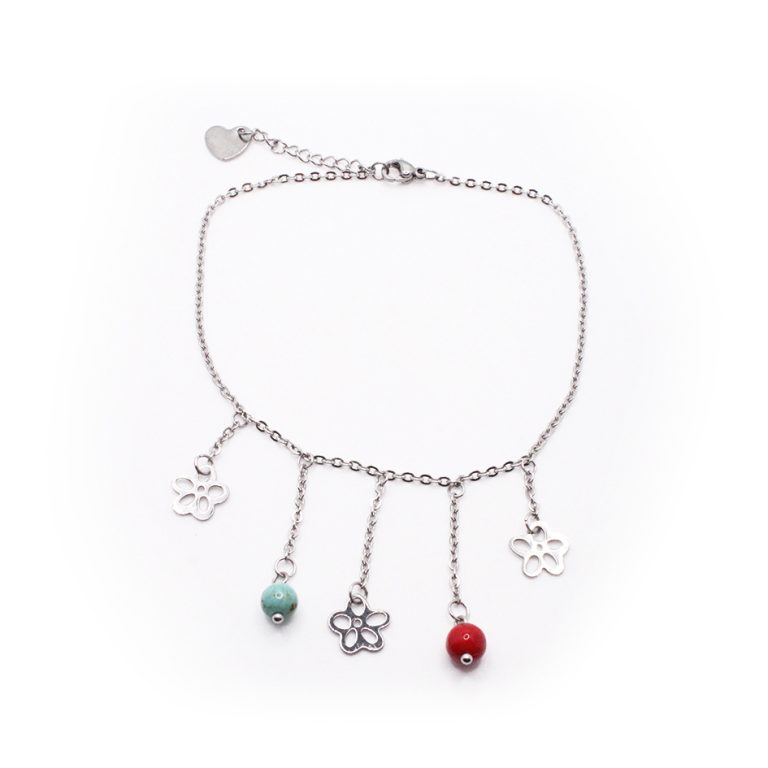 Tobillera de Acero Colgante Plateado Flor, Esfera Rojo, Verde Medida 28 cm – 8026628