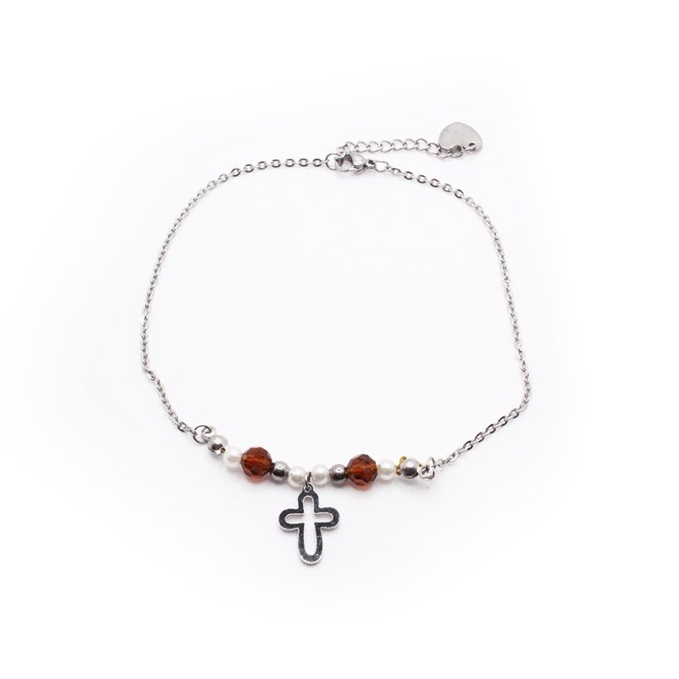 Tobillera de Acero Colgante Plateado Cruz, Esfera Blanco, Marrón Medida 27 cm – 8029127